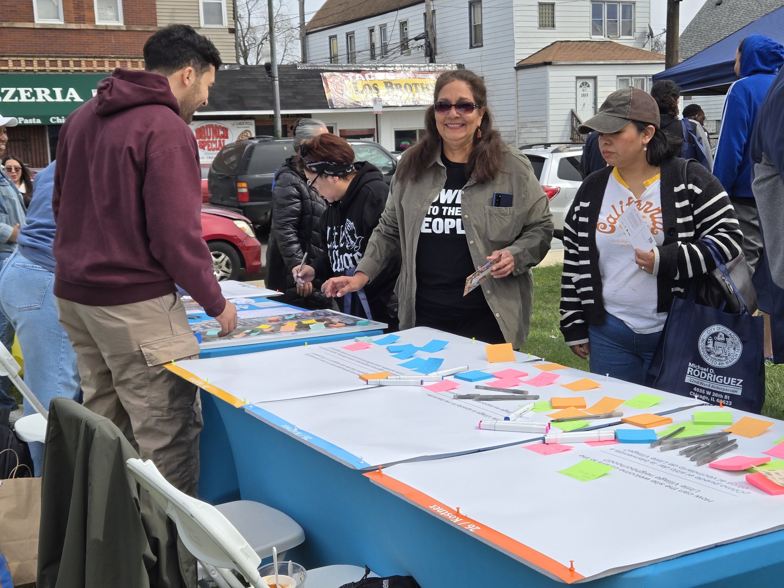 Hosted by the 22nd Ward, in partnership with NeighborSpace, the Chicago Park District, and Human Scale and support provided by Beyond the Ball. A Community Kickoff Event was hosted at the project site. Around 150 people stopped by to learn about the project, participate in hands on activities, enjoy free food (tacos, fruit, corn, churros, ice cream, and agua fresca), and live mariachi music. We encouraged people to explore the site, sign up for the email distribution list, check out the project website, fill out the digital community survey, and attend upcoming events in April/May.